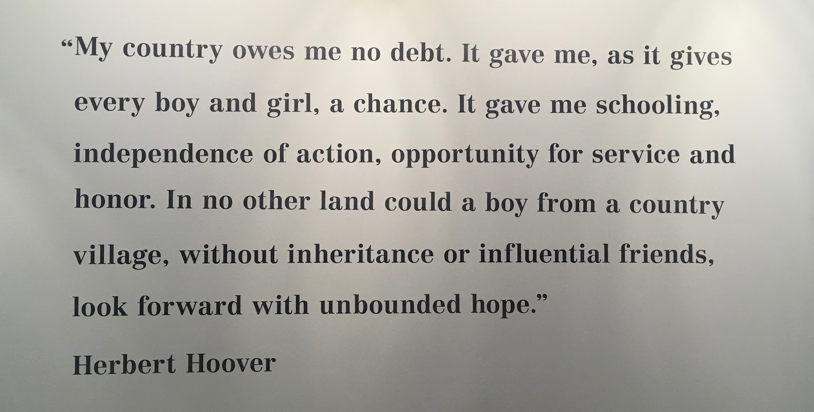 After leaving Iowa City, Iowa, and on our way to Chicago, we passed West Branch, Iowa, the birthplace of Herbert Hoover, the 31st President of the United States, and site of the Herbert Hoover National Historic Site. Being a history buff, I knew I had to make a quick stop to check it out (even if Hoover was a Republican, and keeping in mind the relief work he performed during the Great Mississippi Flood of 1927), but once again Clare and Conor refused to participate in my mini-history course in the U.S. Presidency. They stayed in the car, although Conor was considerate enough to snap one photo of me in front of the visitor center before he retreated to the safe confines of the Prius. I could only linger for maybe 10 minutes or so.